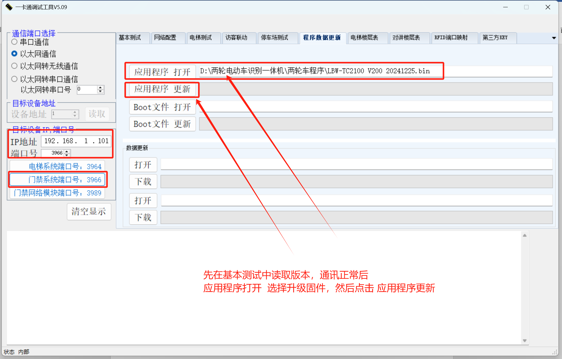 8、兩輪車識別模塊固件升級方法,打開一卡通調試工具,先讀取版本,通行正常后,按如下操作升級